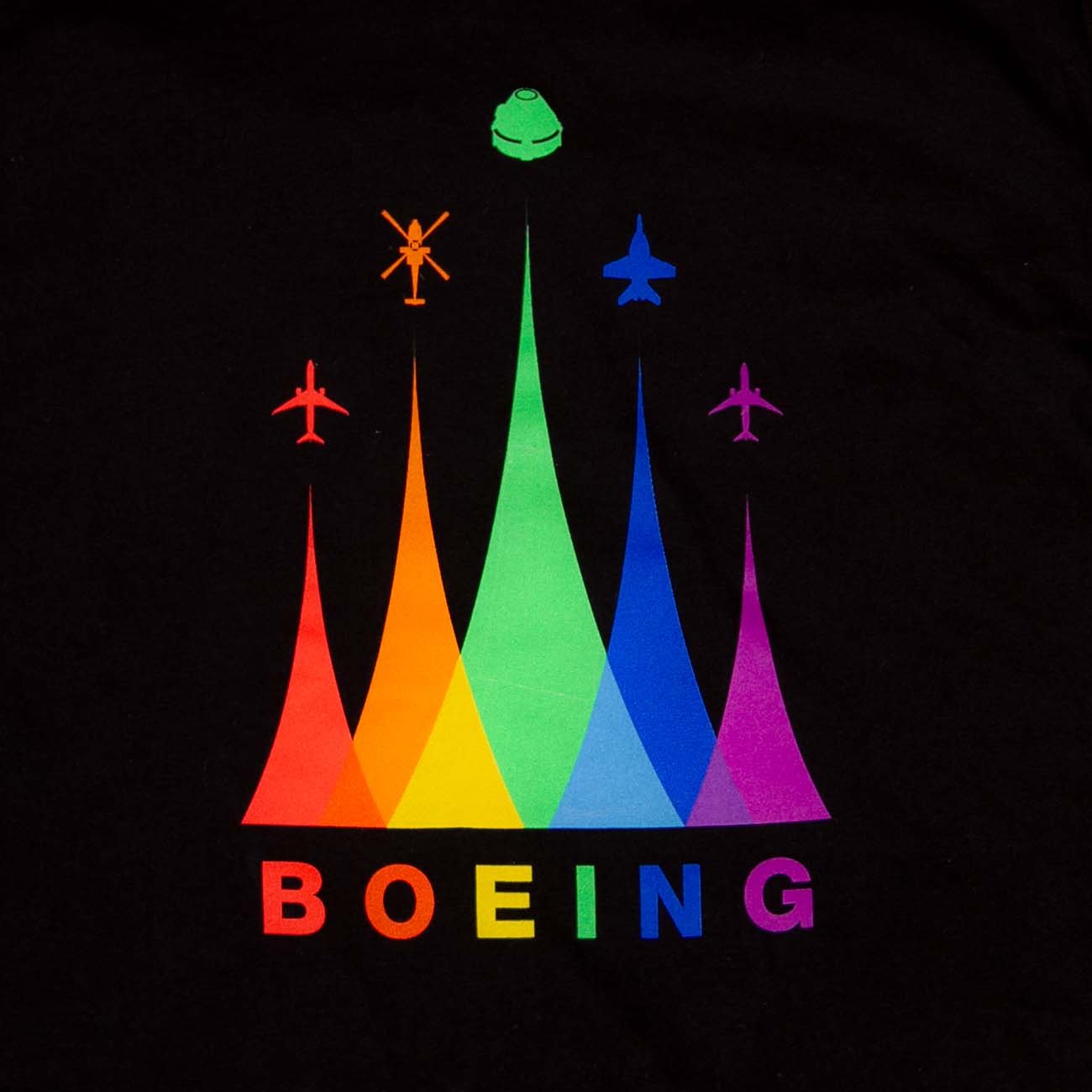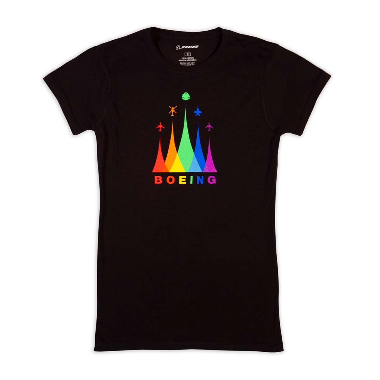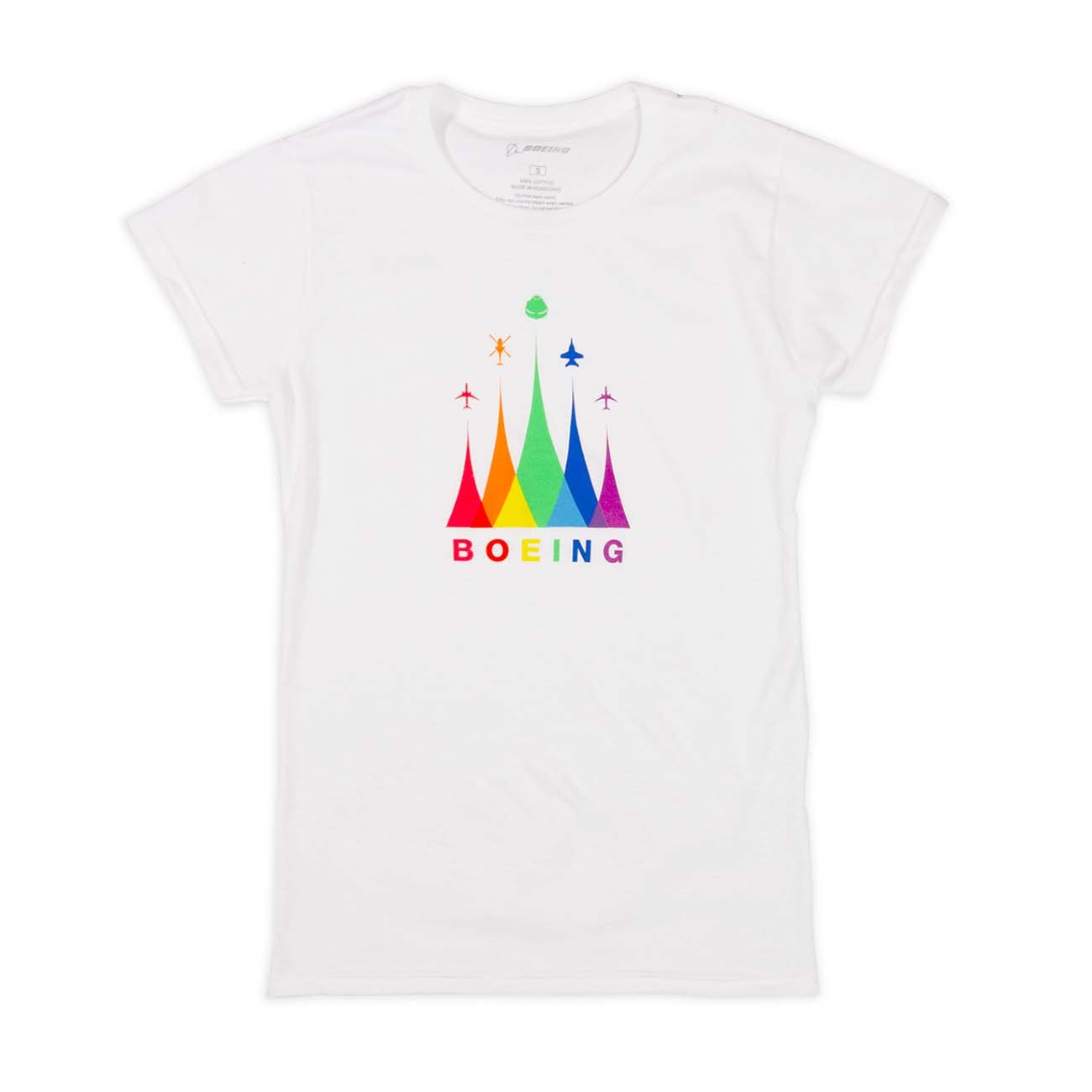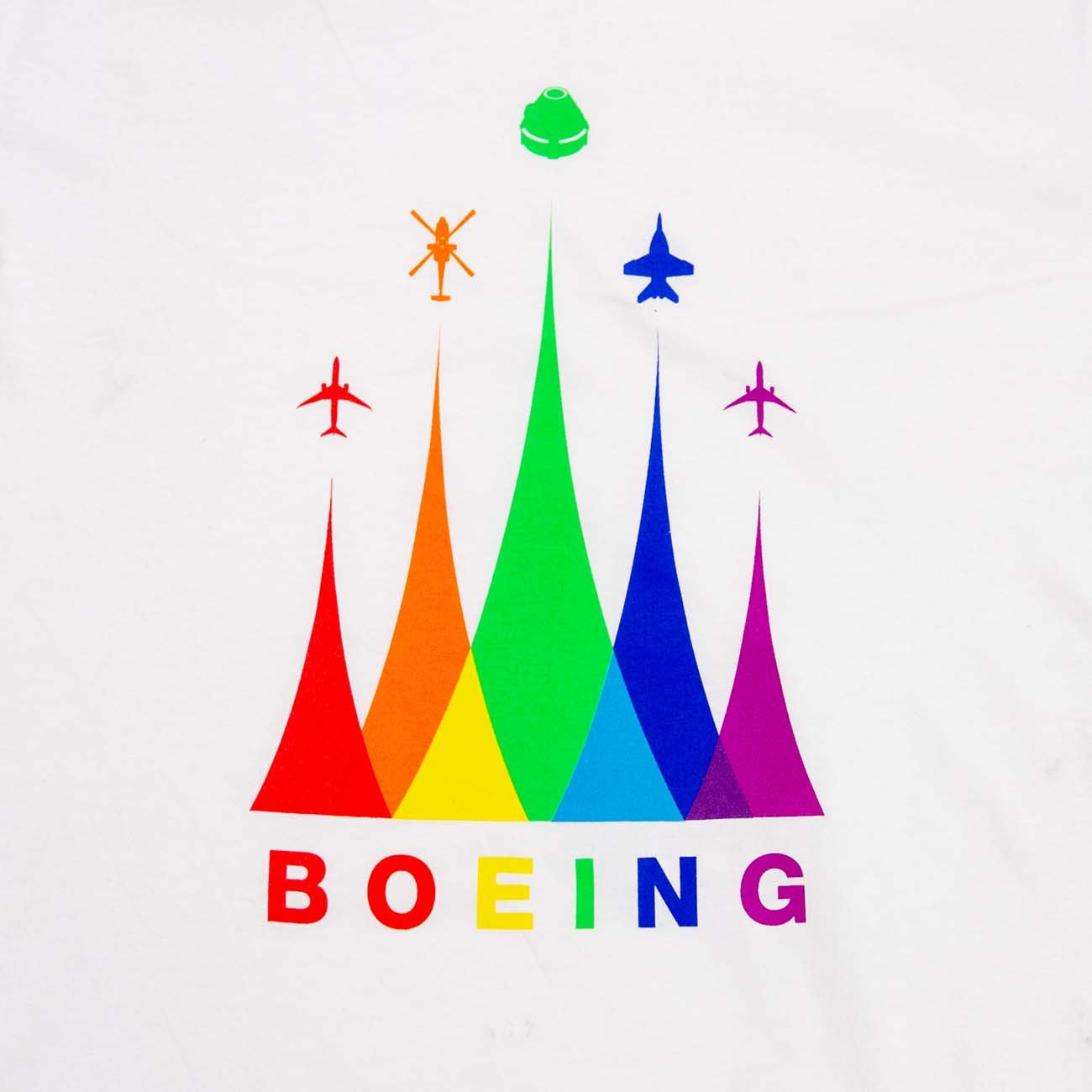 Wear it with Pride. This Pride graphic tee represents our diversity in overlapping, multi-colored waveforms across all Boeing Commercial, Defense, and Space programs.